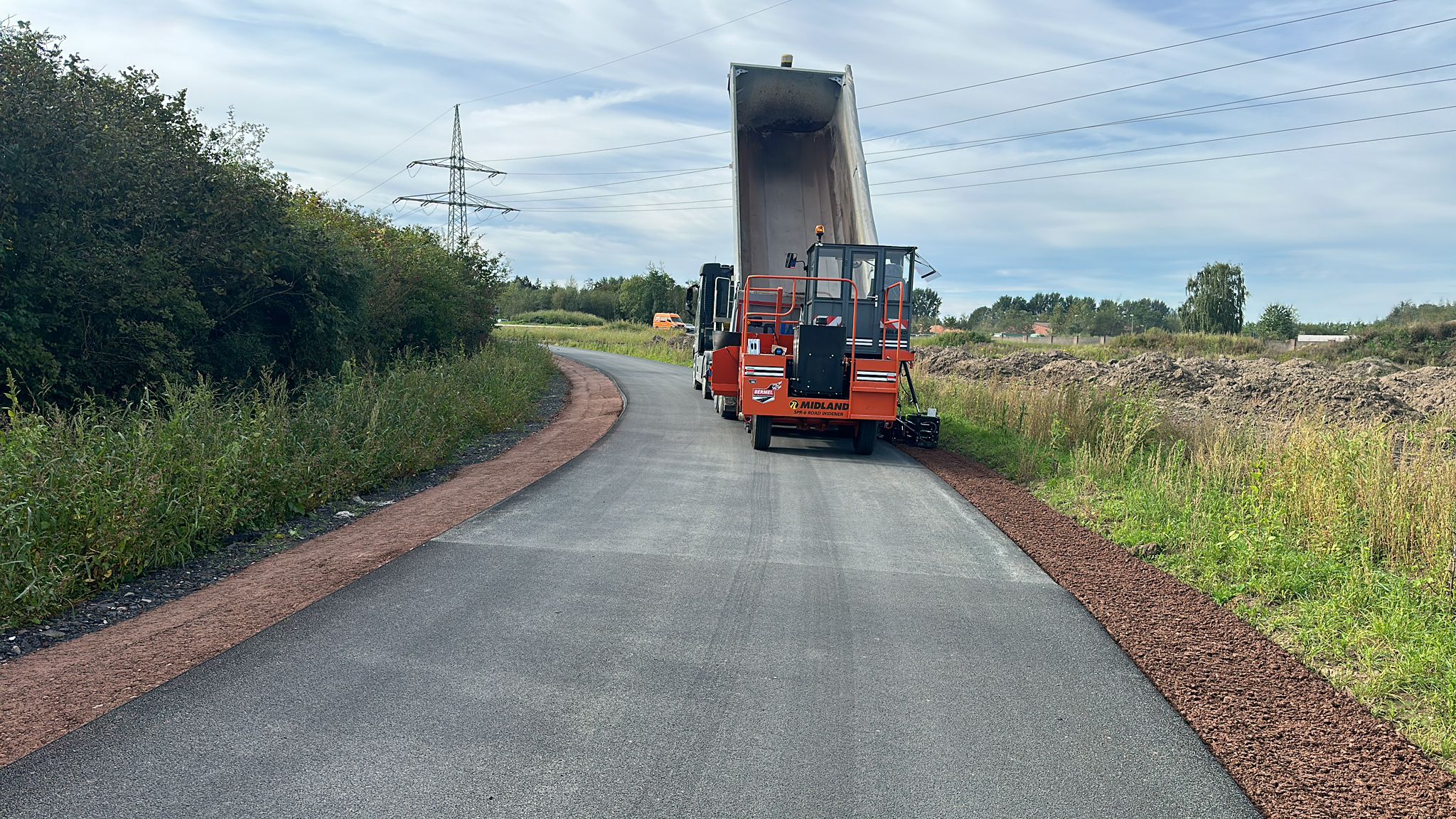 Der maschinelle Banketteinbau, mit unserem Midland Bankettfertiger, von Frostschutzkies, HGT, Oberboden, Sand und Asphalt, ist für uns kein Problem. Wir können Ihnen das Einbaumaterial in unterschiedlichen Stärken, Breiten und Neigungen einbauen. Auf Wunsch und Gegebenheiten bauen wir das Material mehrlagig ein. Mit unserem Midland haben wir nur die Möglichkeit rechts einzubauen. Wir können Einbaubreiten von 0,20 cm bis 2,00 m realisieren. Durch kurze Rüstzeiten ist die Maschine vielseitig einzusetzen.